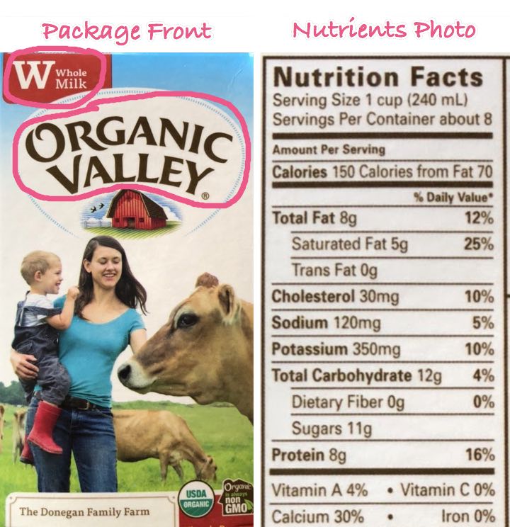 Notice that the first photo captures vendor name Organic Valley and food name Whole Milk. The second photo captures nutrition facts.