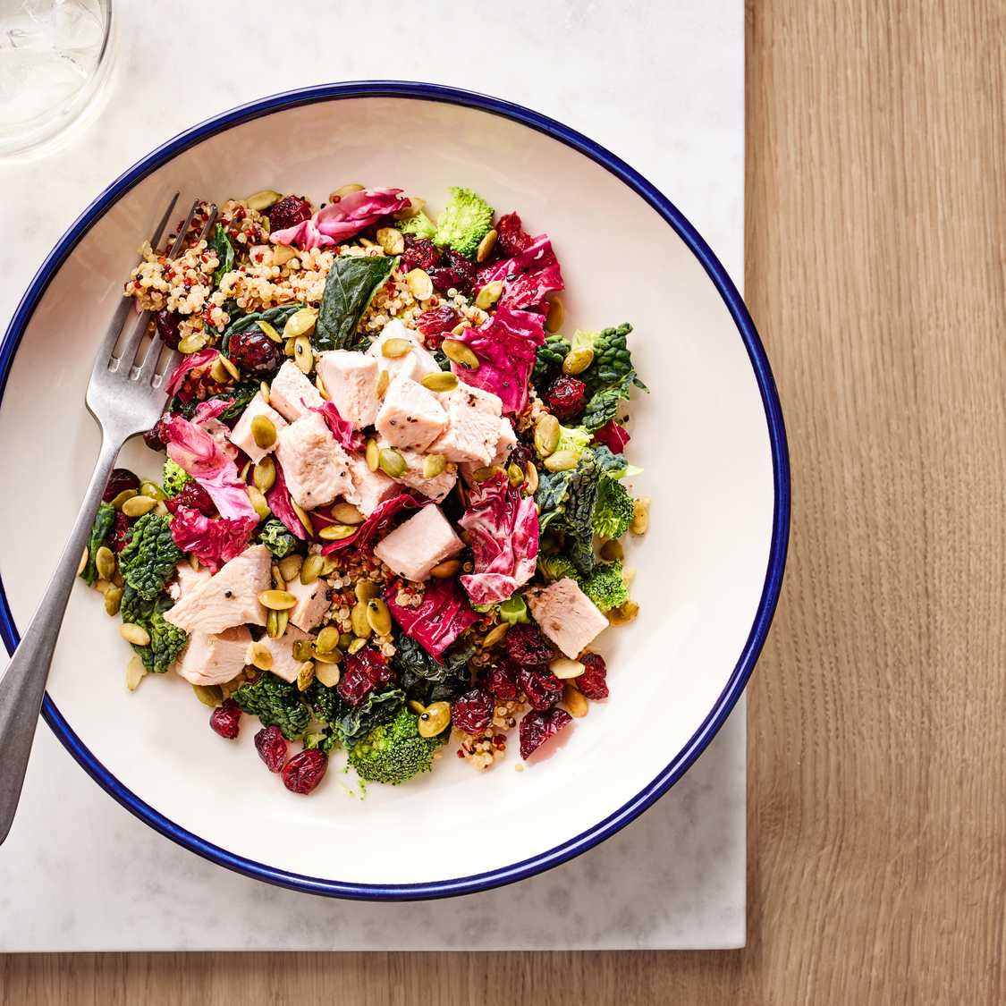 - In a large mixing bowl, toss together all bagged-salad ingredients. Add cooked quinoa to salad, mix well.