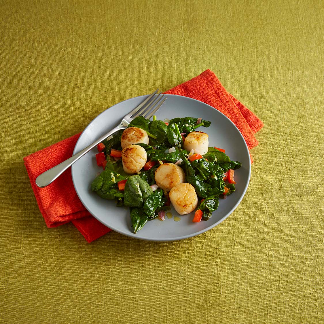 Pan-seared scallops meet wilted spinach and fresh lemon for a light, flavorful seafood specialty.