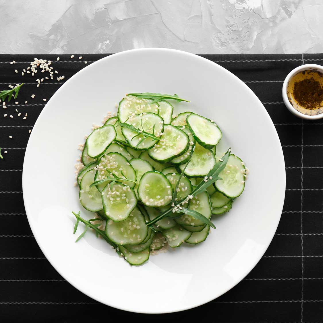 Combine vinegar, sugar and salt in a medium bowl, stirring to dissolve. Add the cucumbers and sesame seeds; toss well to combine.