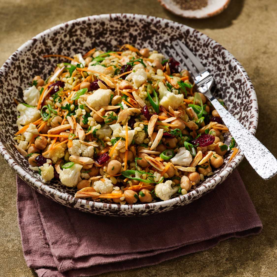 - Add bulgur, chickpeas, parsley, mint, cauliflower, carrots, cranberries, scallions, and almonds to bowl. Stir to mix with dressing.