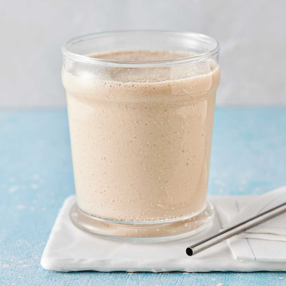 Big on almond flavor from almond milk and almond butter and paired with banana and whey powder. The result is a creamy high-protein smoothie.
