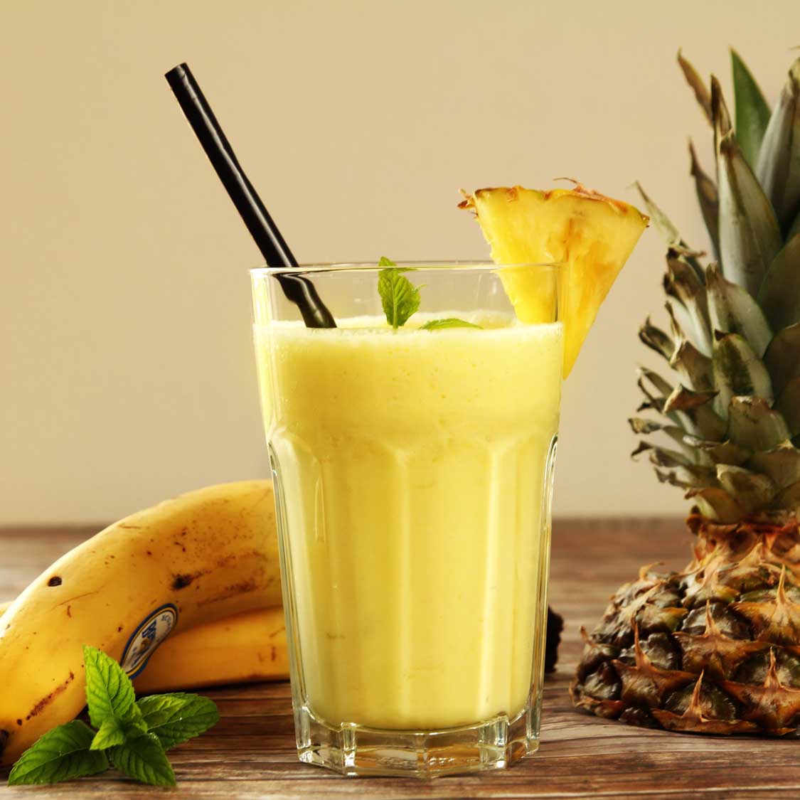 This piña colada-inspired smoothie will make you dance for joy first thing in the morning. Provides an energizing combo of fruit and protein from the Greek yogurt and protein powder.