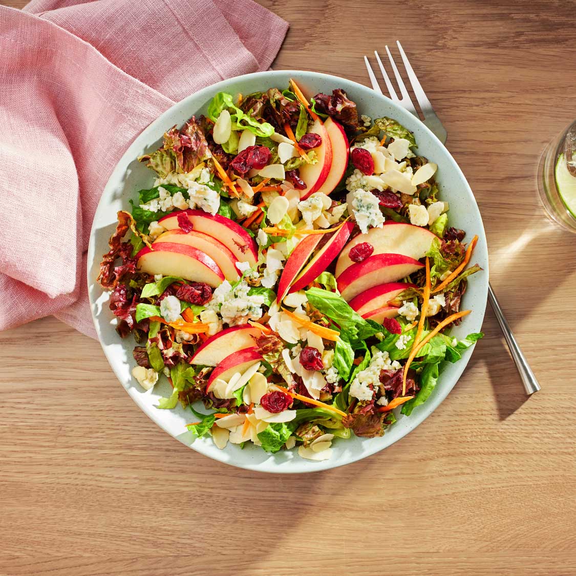 - In a large bowl, mix the lettuce, apples, carrot, blue cheese crumbles, dried cranberries, and almonds.