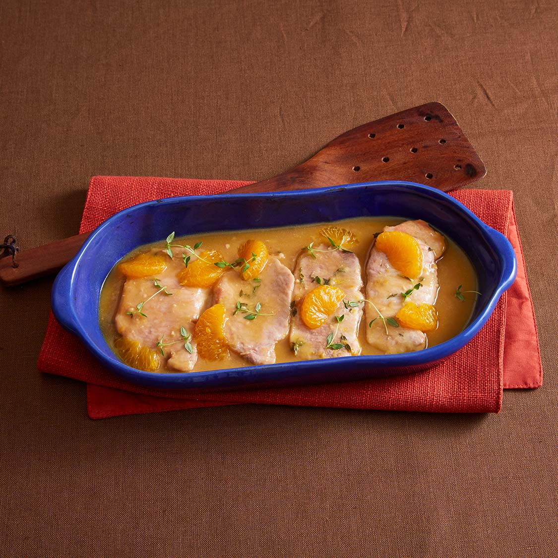 Tender pork chops marinated in a tangy orange-soy sauce make for a quick and flavorful dinner.