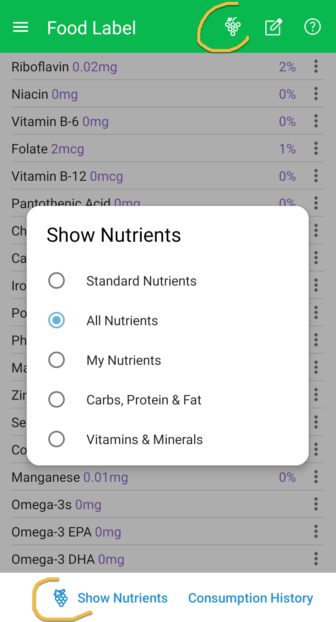 MyNetDiary food labels can contain up to 50 nutrient values. Use Show Nutrients option to choose a nutrient set you want to look at: