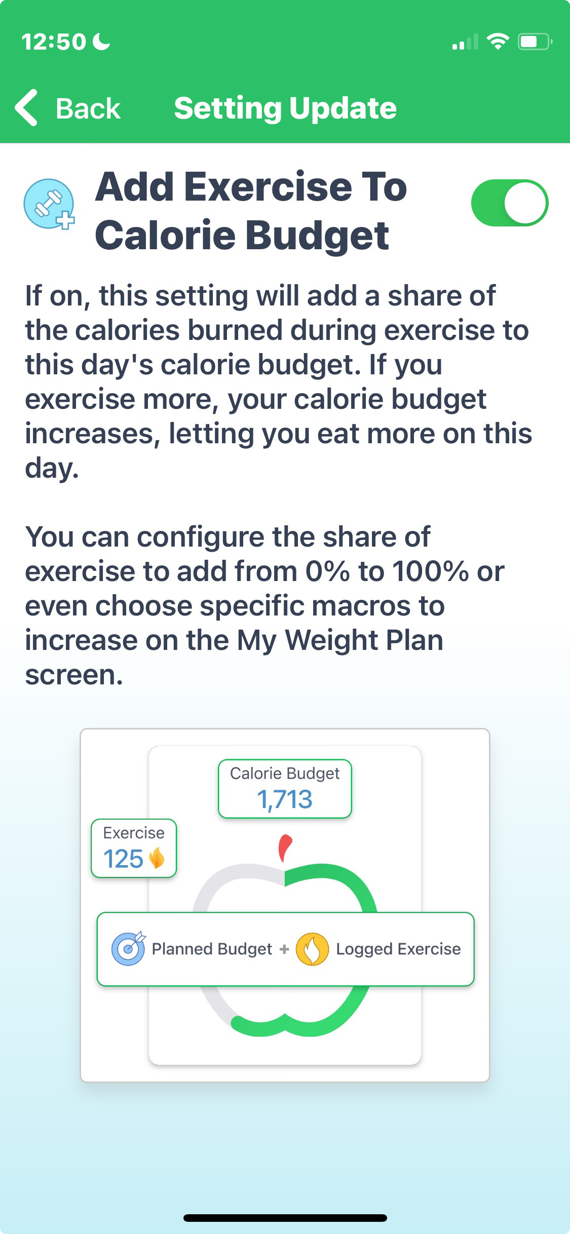 Enabling the feature will adjust your daily calorie budget based on your logged exercise. This is helpful for users whose exercise or activity varies greatly from day to day.