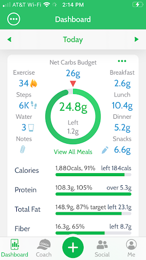 Front and center on your dashboard, the net carb budget grabs your attention when you open the app.