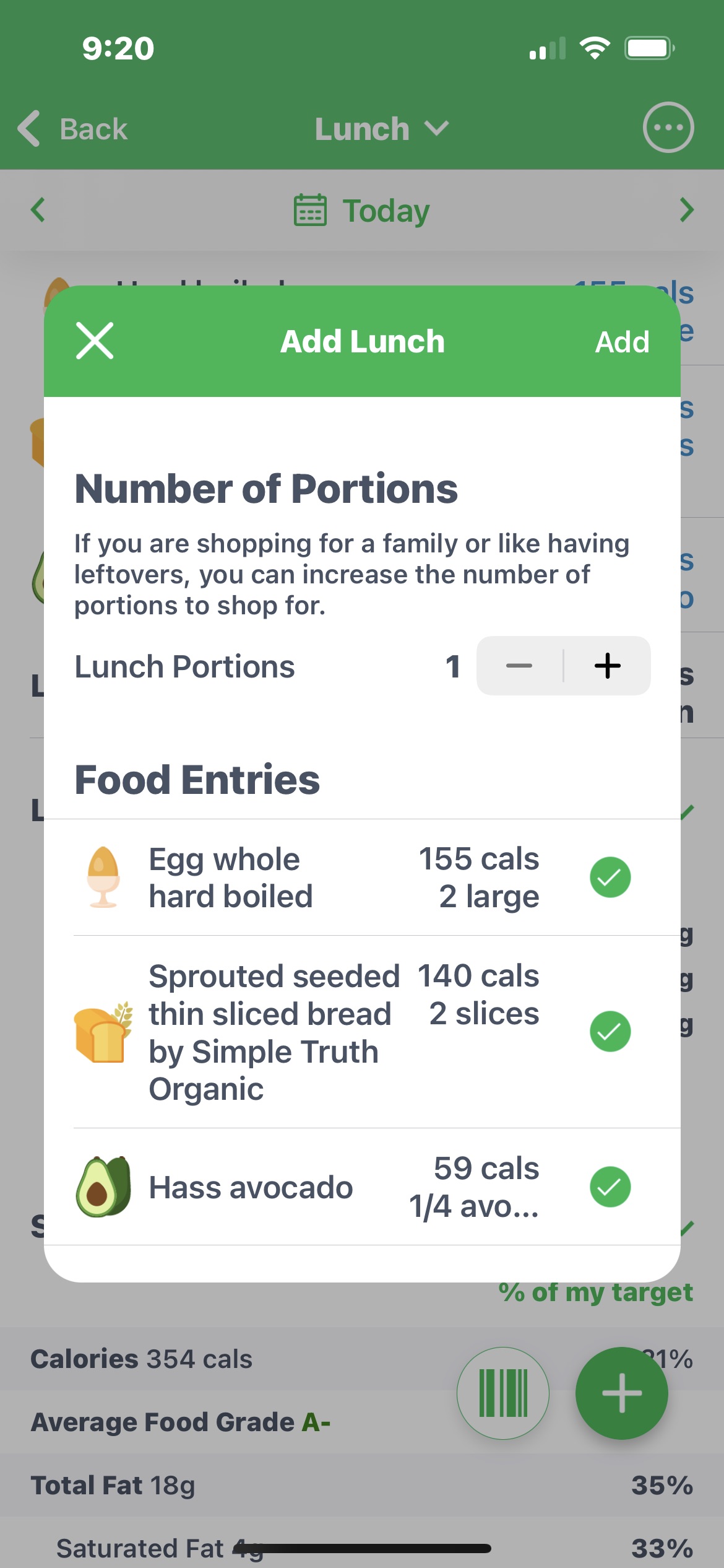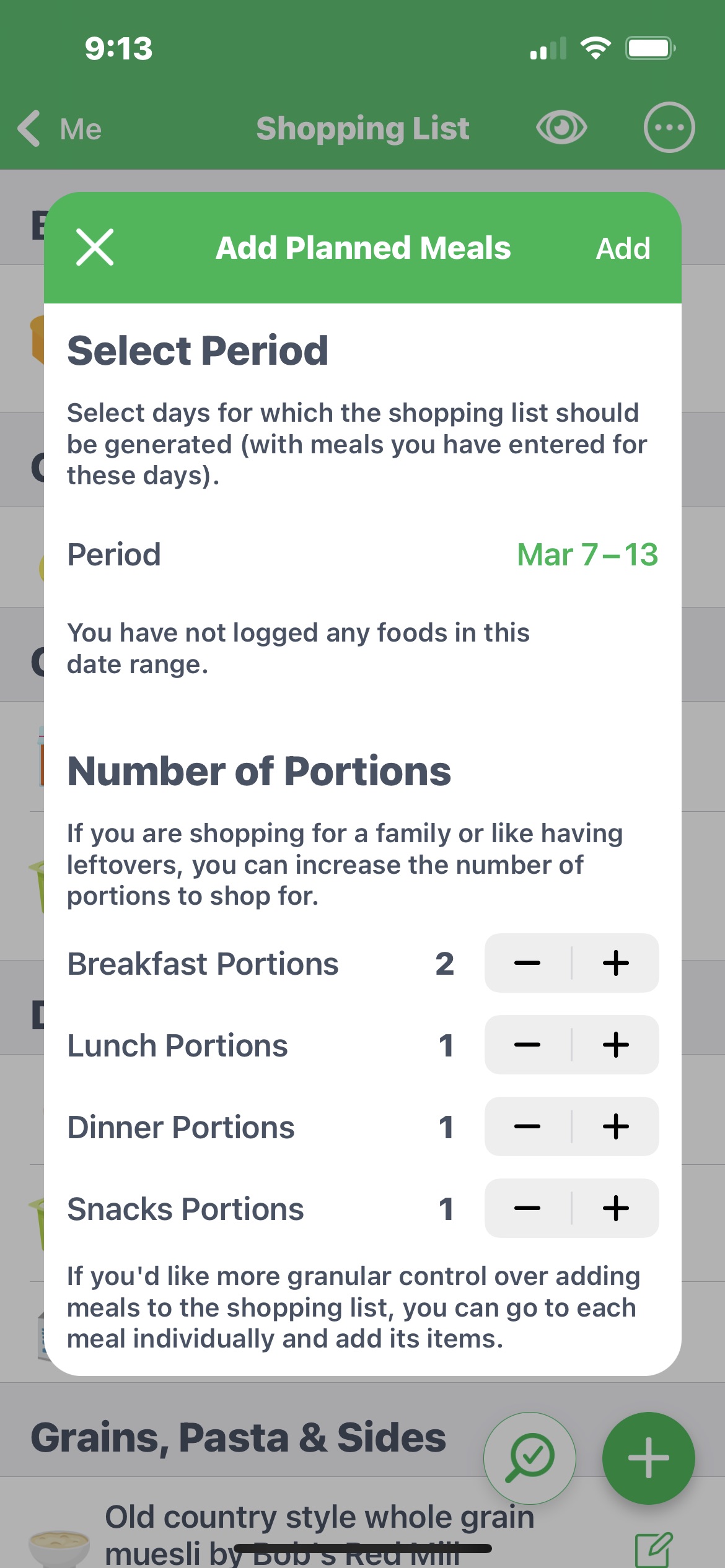While tracking your meal, tap the circle with three dots in the upper right-hand corner of the screen to add foods or other items to the shopping list. You’ll be asked, “Would you like to add just this breakfast or all planned meals?” Remove the checkmarks next to the foods you do not need on your list (see below).