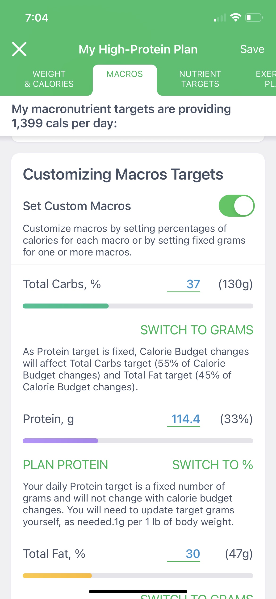 After you have set your protein and fat targets, the remainder of your calories will come from carbohydrates. You can also customize your carb target in the app.