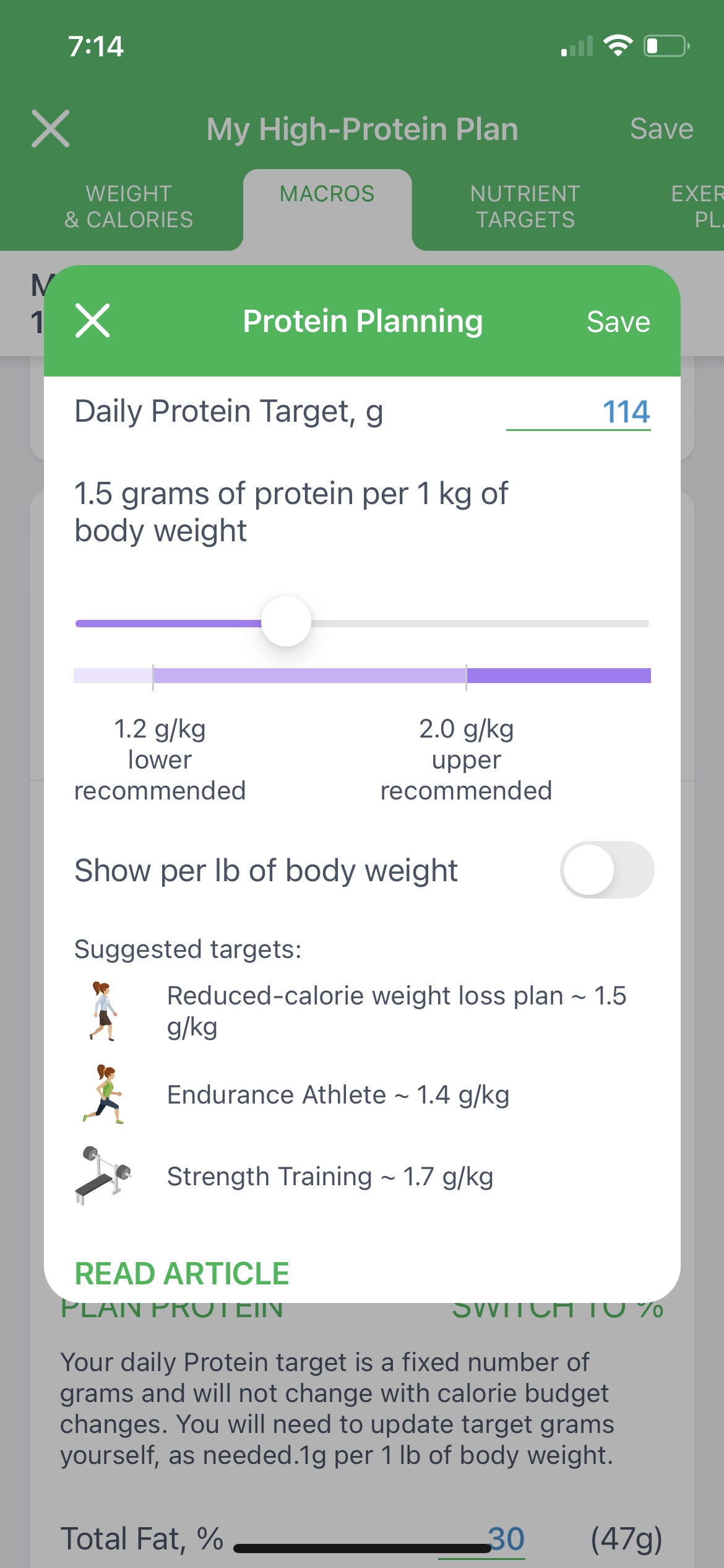 The default fat target for MyNetDiary’s Premium High-Protein plan is 30% of calories from fat. You can customize this target to meet your individual goals.