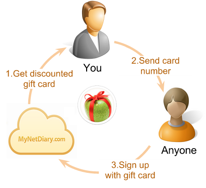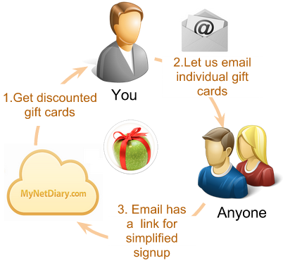 Once sent to the recipient, the gift card code contains all the necessary information for a streamlined sign-up. We will require no payment from the recipient. MyNetDiary can email each gift card code on your behalf, along with a special sign-up link to join your Community group. If the recipient is already a MyNetDiary member, the gift card can be used to prolong their existing membership.