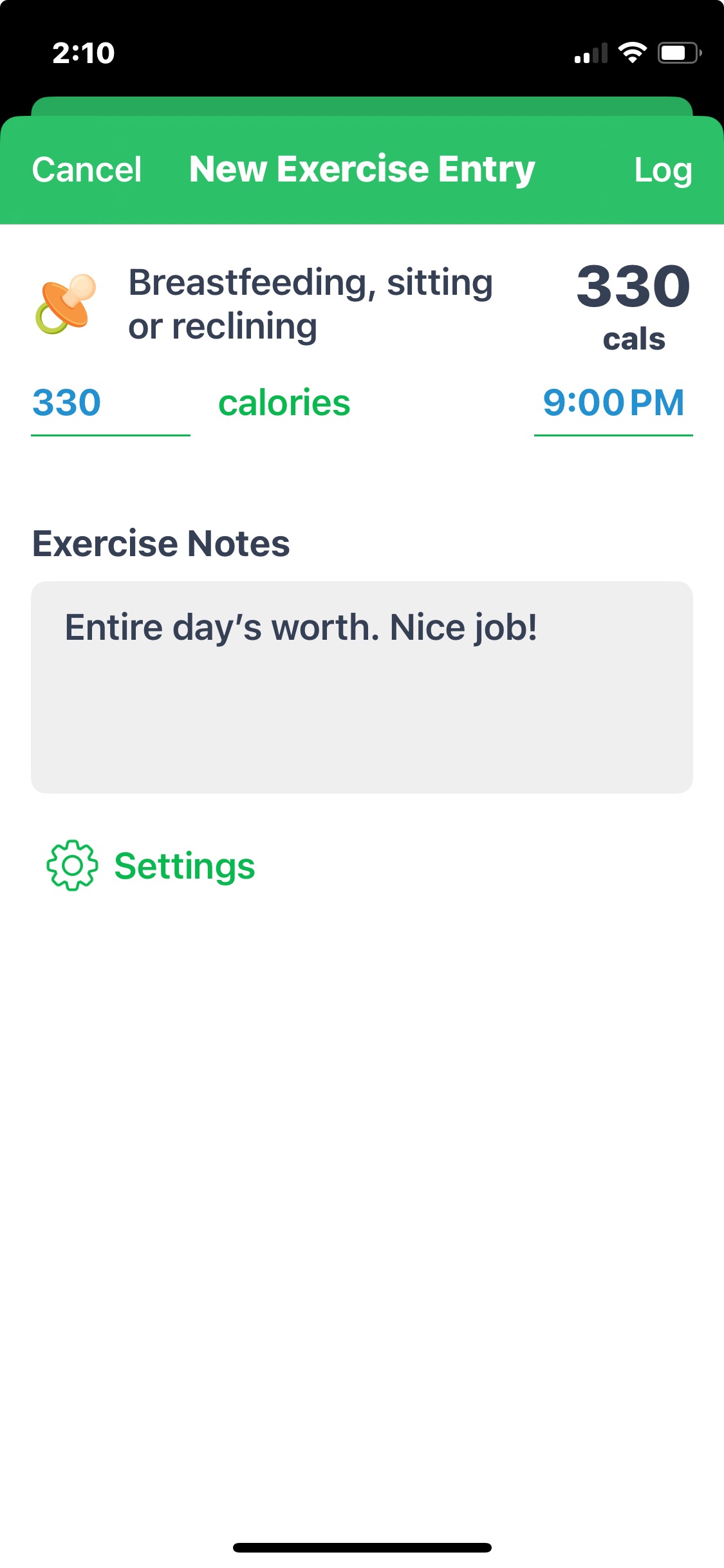 The easiest way to account for the calories burned while breastfeeding is to enter it as an activity in the exercise log. To do this, select to add exercise. Search “breastfeeding, sitting or reclining.” In the activity page, click on the units to change to calories and enter the calories burned for the day.