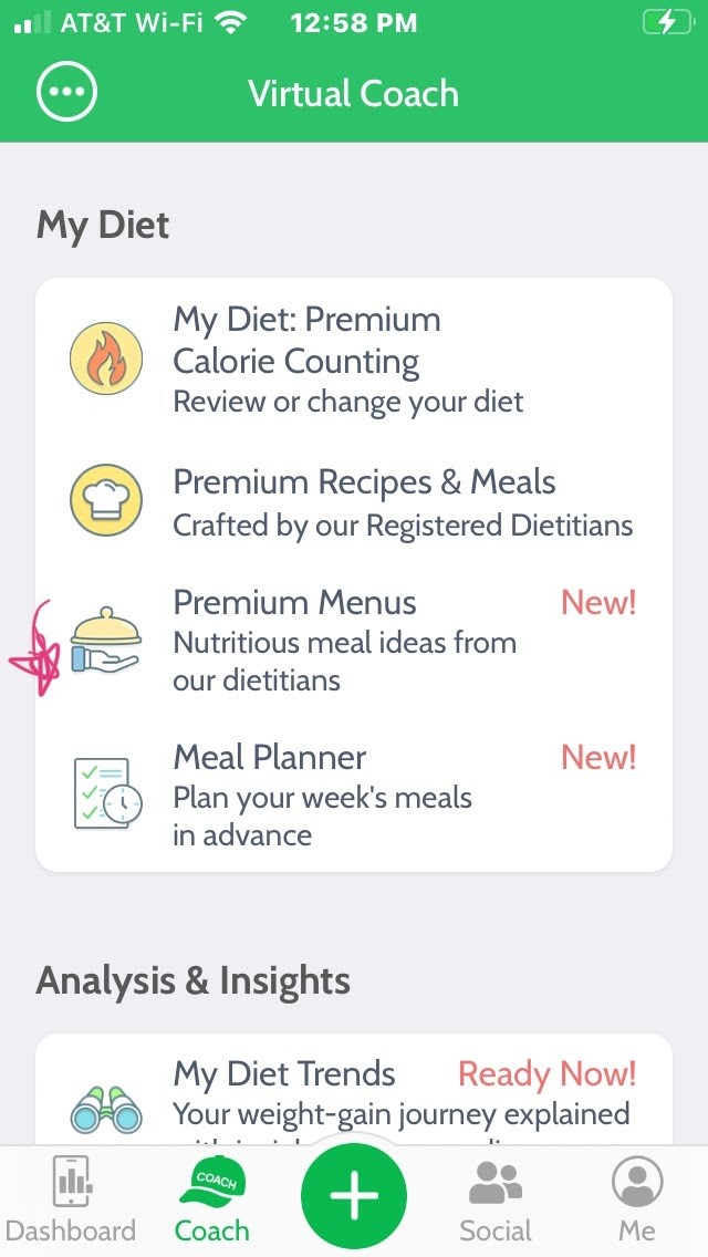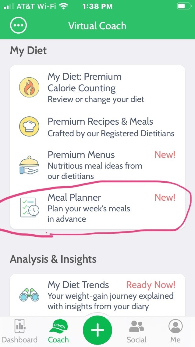 MyNetDiary's new Meal Planner feature allows you to use the app's Premium Menus or your recipes to map out your meals ahead of time. Access this feature from the "Coach" tab in the app.