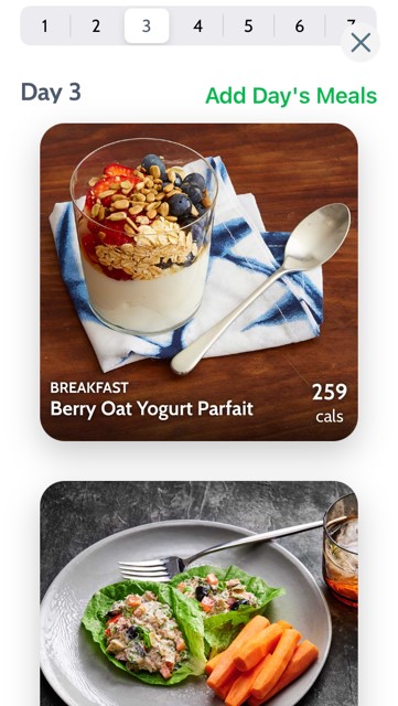 Tap to add a single meal or all day's meals to either your Food Log or Meal Plan. Then when the day arrives, just prepare and log the meal as you consume it.