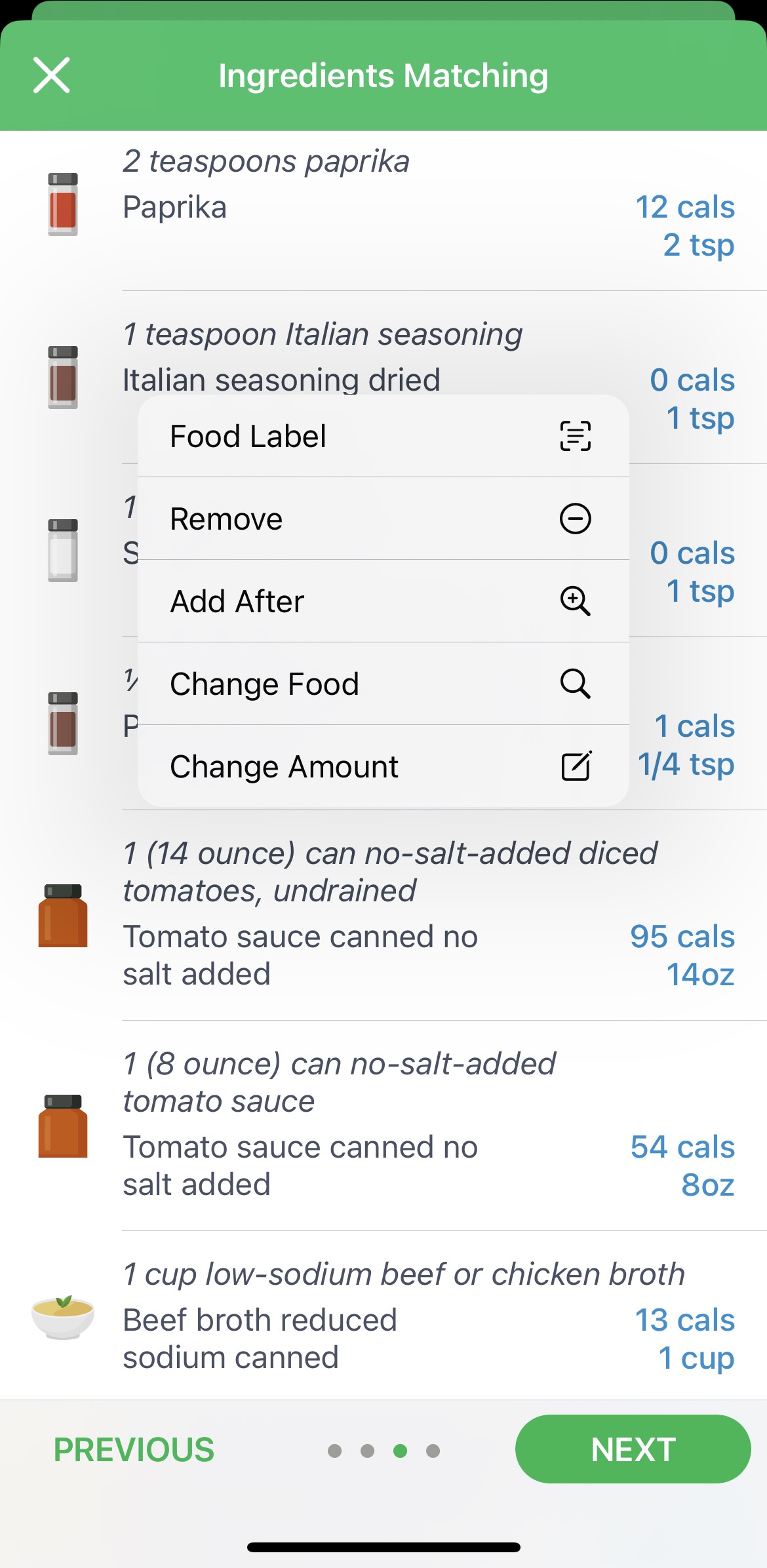 Please double-check the imported ingredients before proceeding. If there is a mismatch, you can easily correct the food or amount.