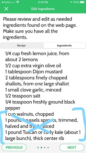 To help our ingredient matching system work best, clean up the imported ingredients in the Edit Ingredients screen as needed, omitting unnecessary instructions or modifiers. Remove any ingredients you won’t be using, such as optional ingredients or serving suggestions.