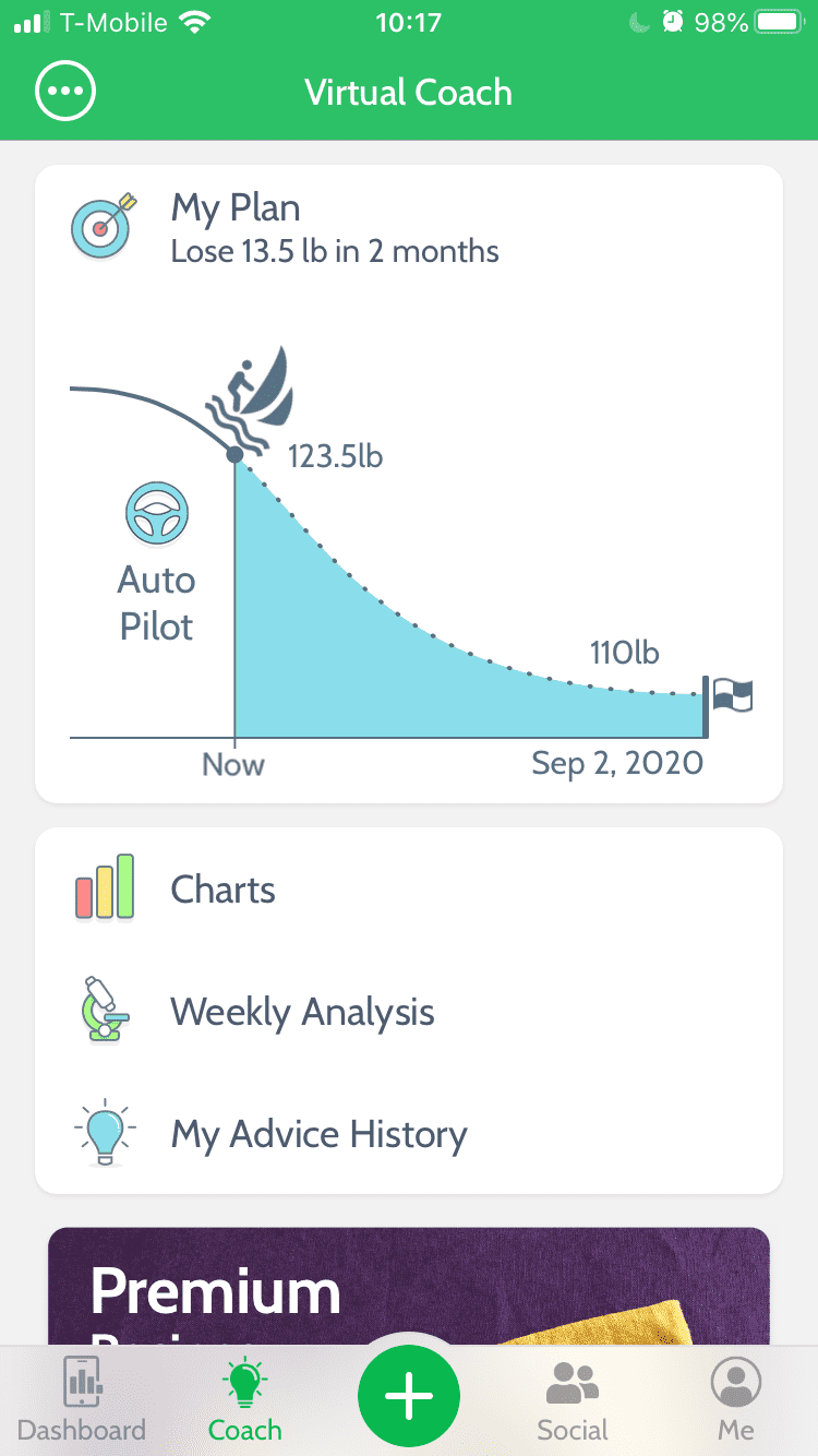 In the Coach tab, you can check or update your diet plan, look at your weight and nutrient charts, and search through Premium Diets and Premium Recipes.