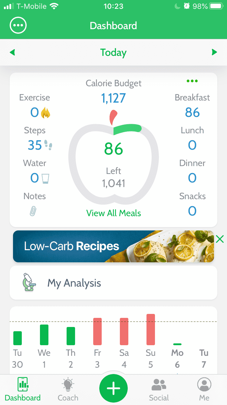 The Bar Chart under the My Analysis item shows you an overview of your progress for the past week. A green bar indicates that you were within your calorie budget, while a red bar indicates that you went over your budget on that day.