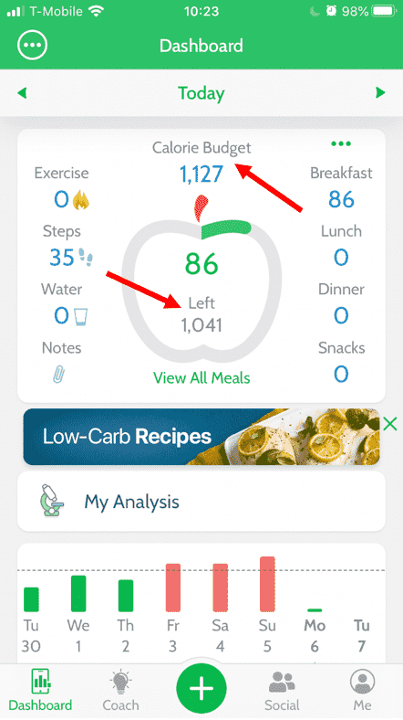 The top of your Dashboard shows you your Daily Calorie Budget and lets you know how many calories you have left for the day. To learn more about how your Calorie Budget is calculated, see How is Calorie Budget calculated? FAQ.