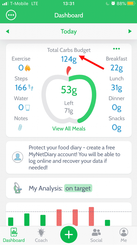 You can reconfigure your dashboard at the bottom of the screen, in “Configure Dashboard” > “Select Dashboard”. You can choose one of the built-in layouts based on what you want to track: calories, macros (like carbs and proteins), diabetes and BG, or a Low-Carb diet.