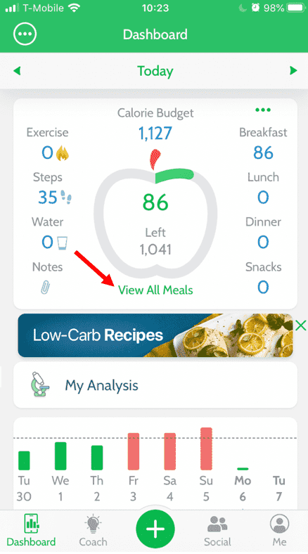 To see an overview of your meals for the day, you can click on “View All Meals” on the main item of the Dashboard. To view a specific meal, click on a meal on the right hand side. You can also log foods and get more food tools in the meal screens.