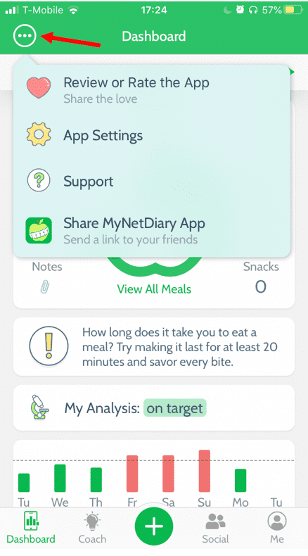 The menu button in the top left corner opens the Menu where you can review or rate the app, go to App Settings, get support, or share MyNetDiary with a friend.