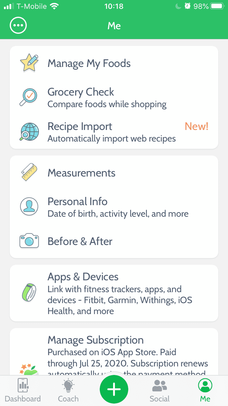 In the Me tab, you can manage your foods, recipes, and body measurements, as well as access your account, App Settings, and the Support screen.