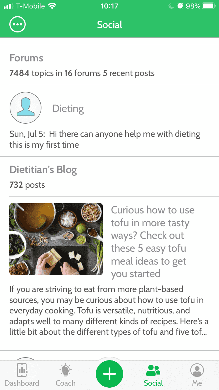 The Social tab connects you to the MyNetDiary community with access to forums and the Dietitian’s Blog.