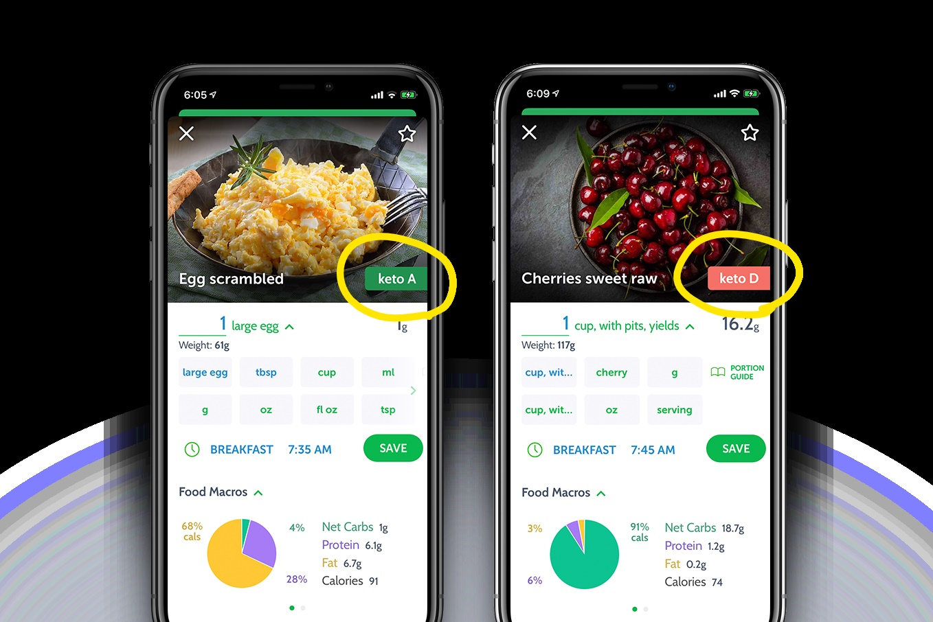 Here is an example of keto food grade displayed for two food entries: