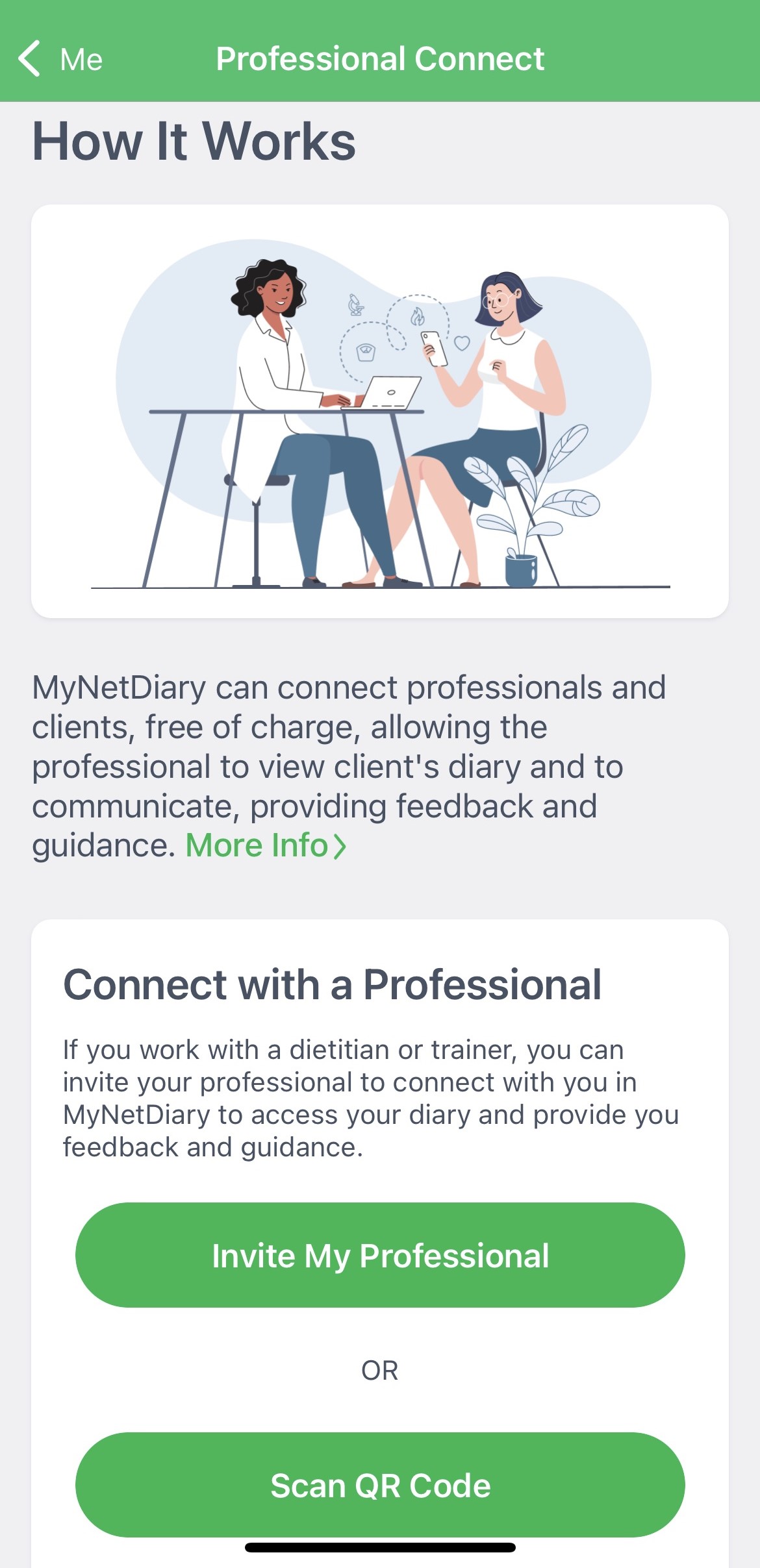 Are you working with a dietitian or trainer? Use MyNetDiary’s Professional Connect to maximize your results!