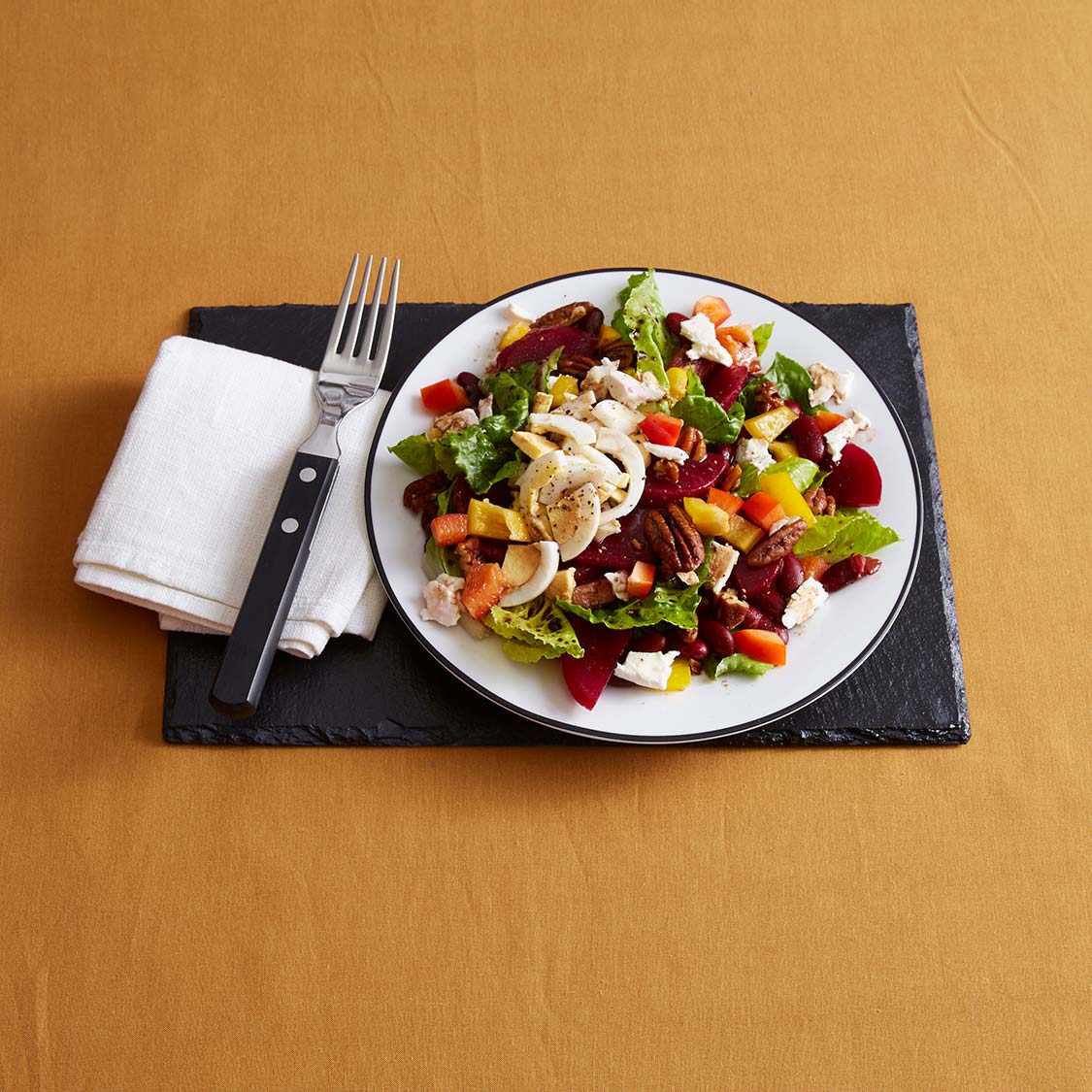 This salad is a true powerhouse of filling ingredients, balanced in flavors and texture. Lettuce paired with kidney beans, egg, sweet peppers, beets, feta, pecans, and avocado oil turns this salad into a complete meal.
