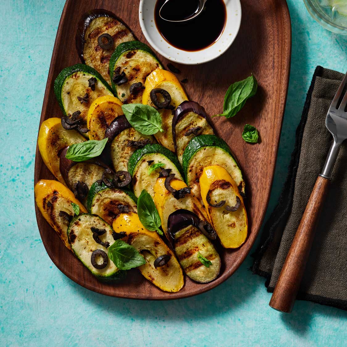 - Arrange grilled vegetables on a serving platter. Drizzle with balsamic vinegar and remaining 1 tbsp oil. Top with minced olives and fresh basil leaves.