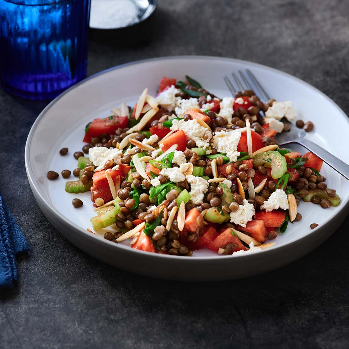 - Evenly divide the lentil mixture into 4 bowls. Top with tofu crumbles and roasted slivered almonds.