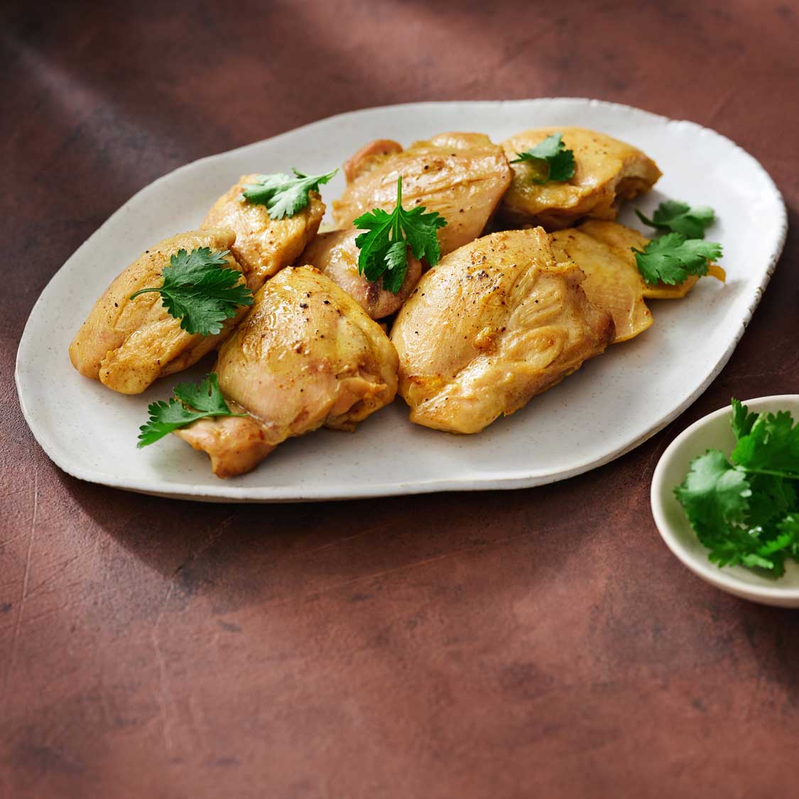 Transfer chicken to serving platter and sprinkle with cilantro leaves.