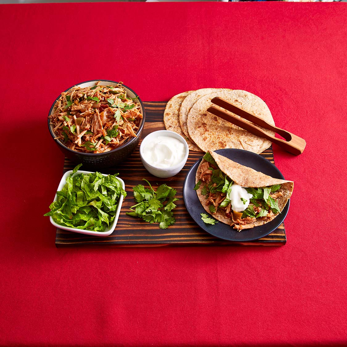 - Spoon 1/2 cup pork mixture on each tortilla and top with shredded lettuce and yogurt.