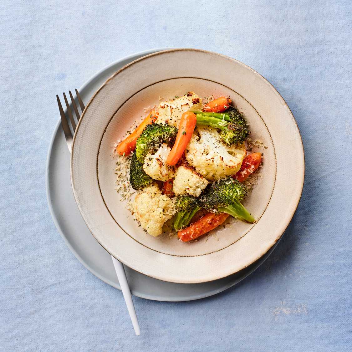 • Spread broccoli, cauliflower, and carrots evenly on a baking sheet.
