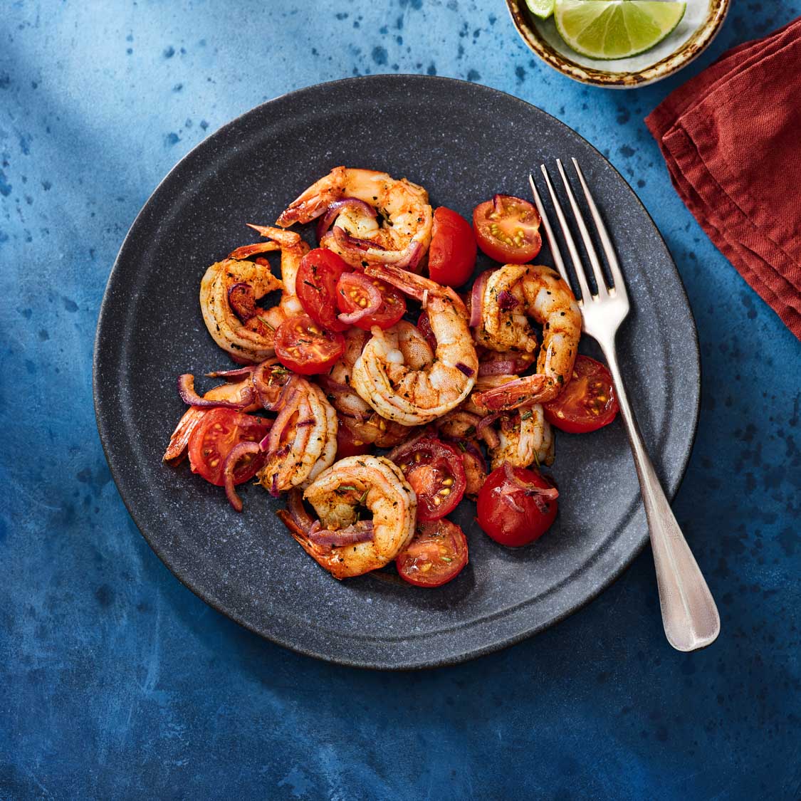 Add onion and tomatoes; cook, stirring occasionally, 1 minute or until tomatoes are hot and onion is slightly wilted. Add shrimp back to skillet and toss together.