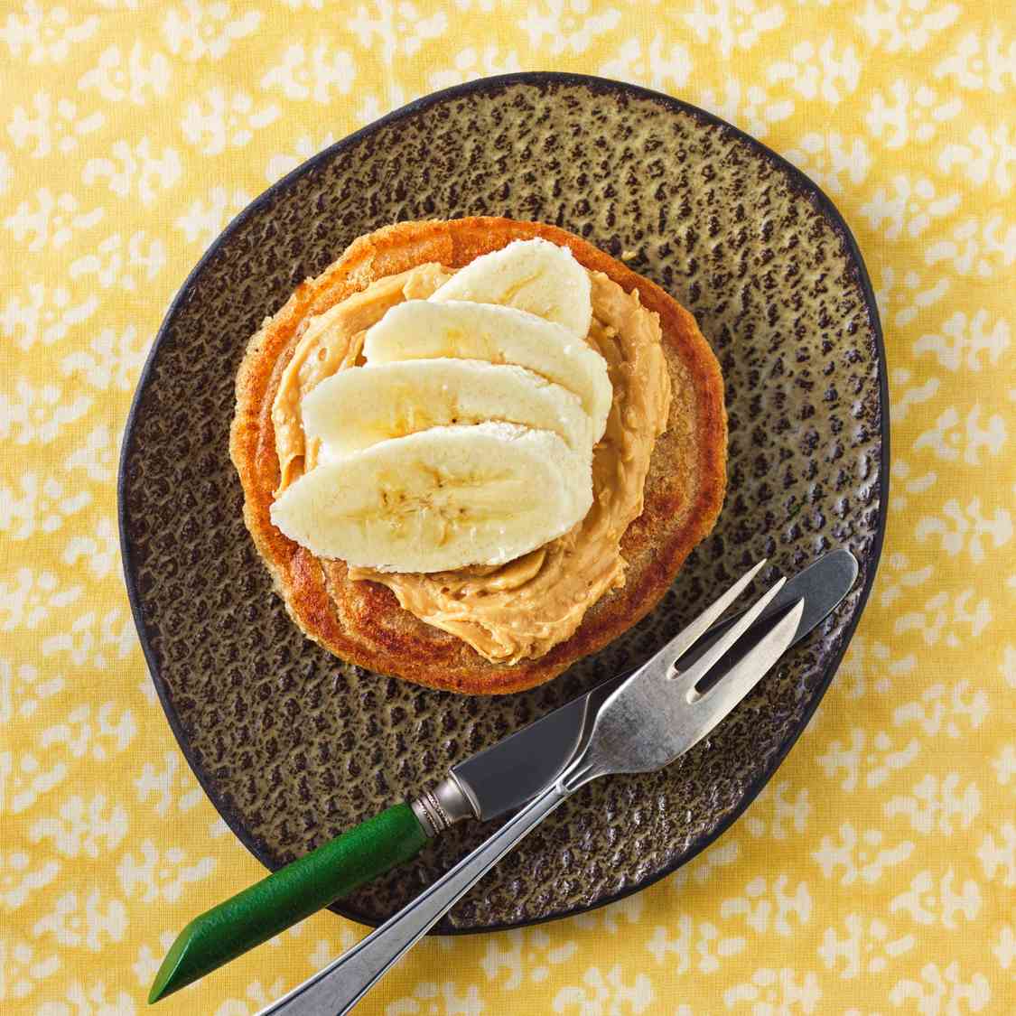- Top each pancake with 1 tbsp of almond butter and 1/4 cup sliced bananas.