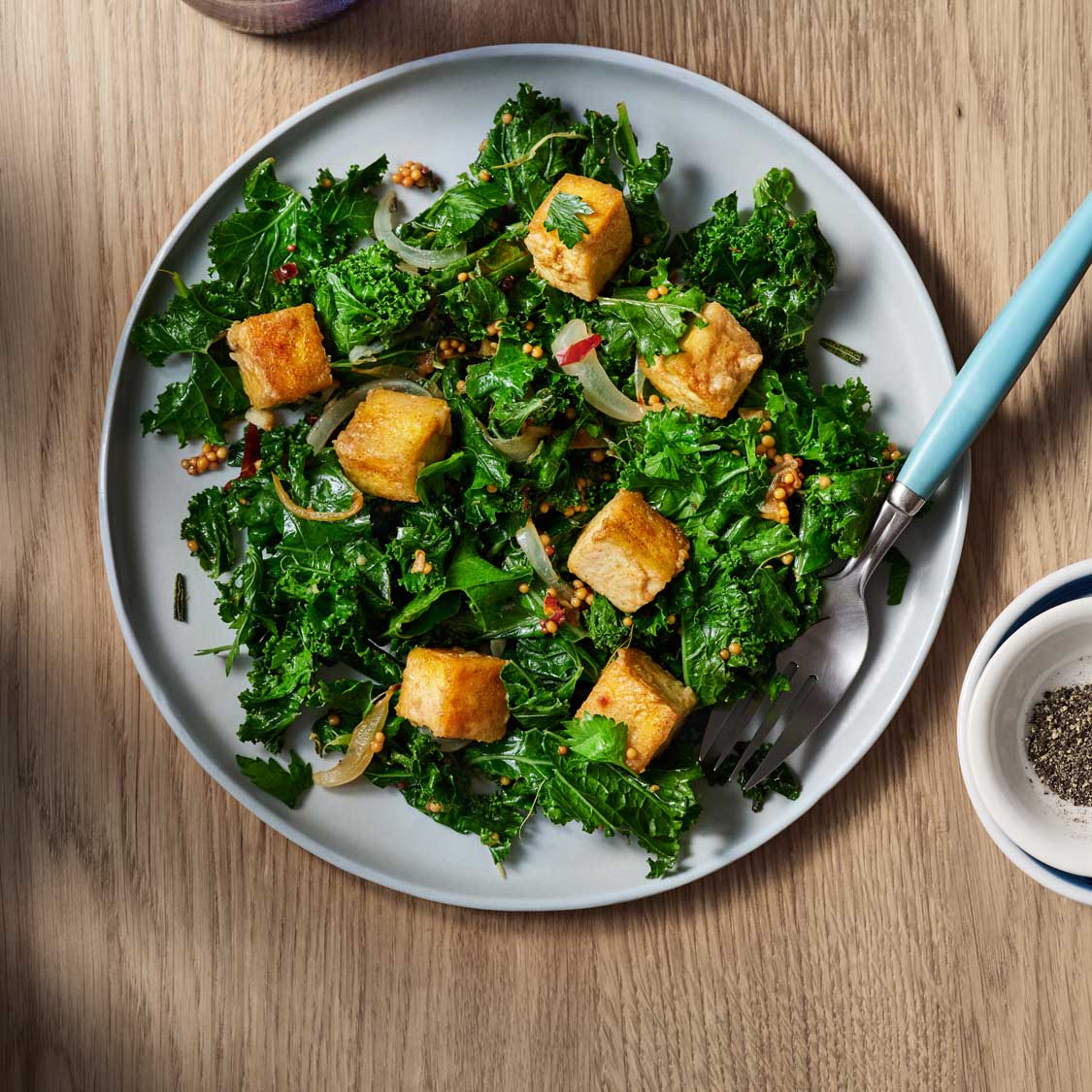 - Place kale mixture and tofu into a large serving bowl. Gently stir to mix. Garnish with chopped parsley.