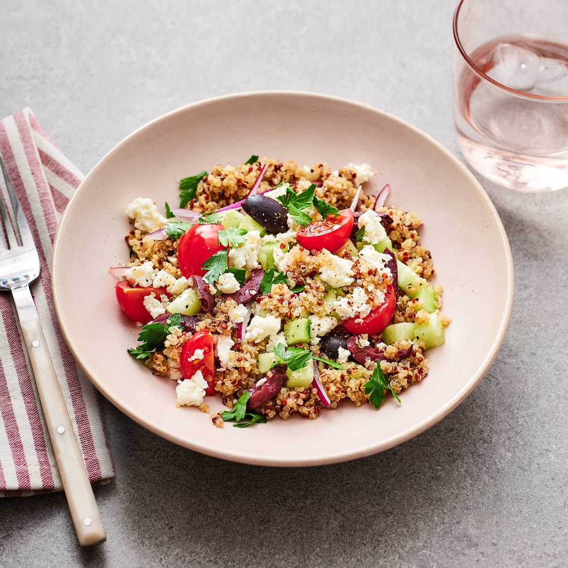 - Once quinoa is cool, top with olives, red onion, tomatoes, feta, and cucumber.