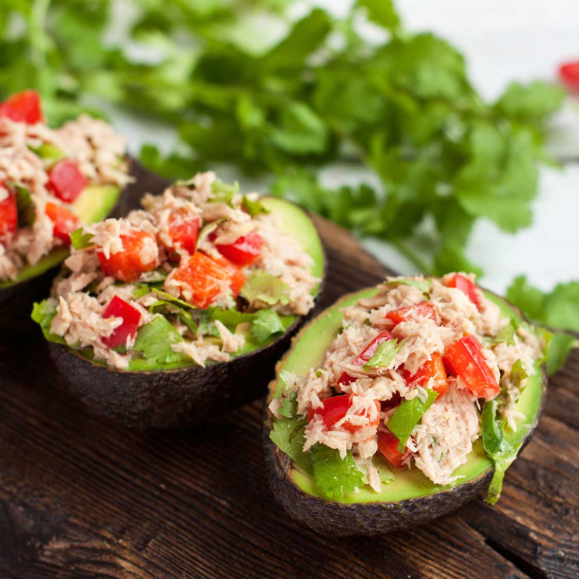- Drain 2 cans of tuna. Mix with the avocado and salsa. Fill avocado skins with mixture.