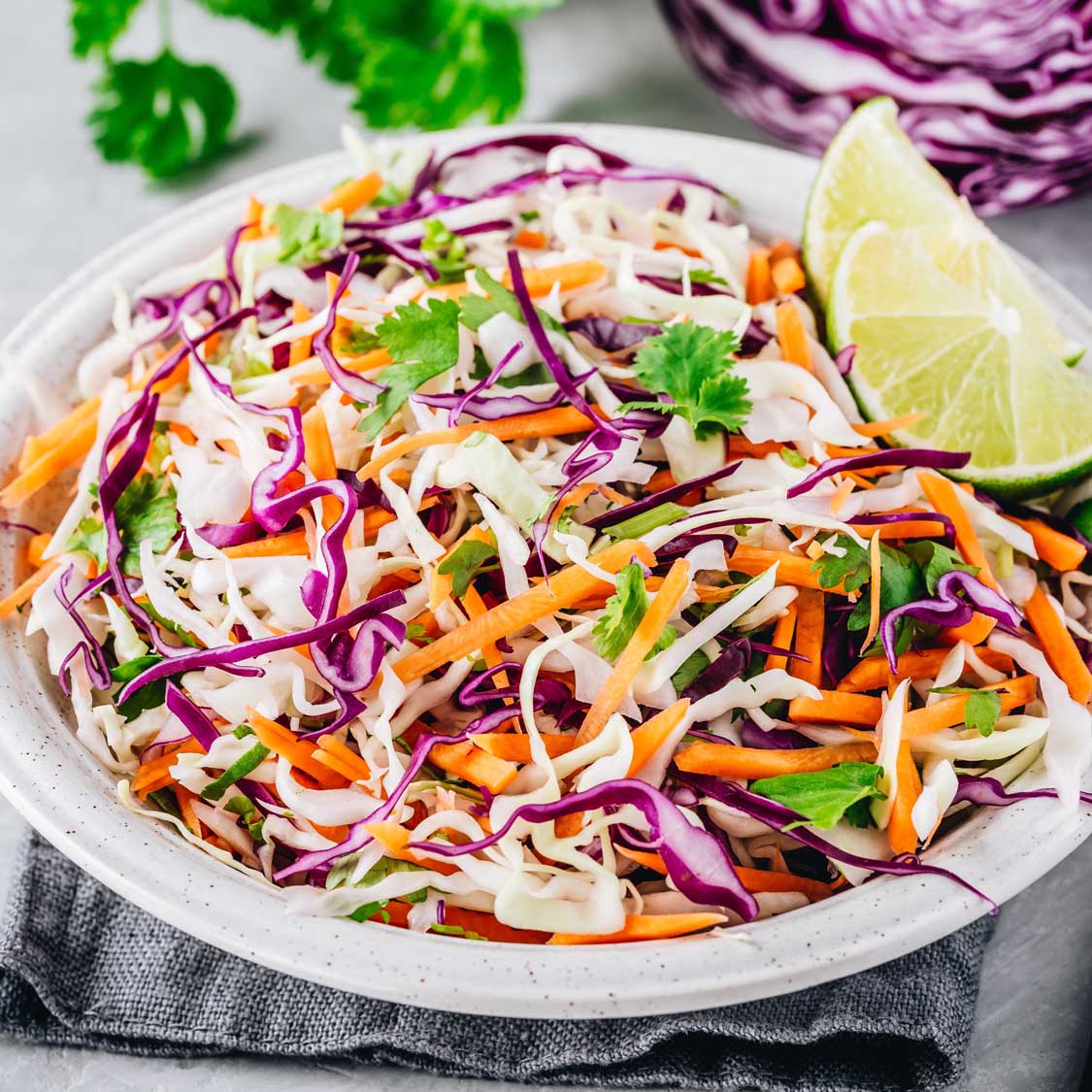 A vibrant and zesty side dish that brings a bold kick of heat and freshness to your meal. This slaw features a mix of crisp, shredded cabbage and carrots served with a savory and sweet dressing.