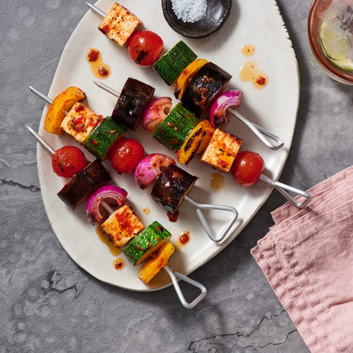 - Thread tofu and vegetable pieces onto 8 skewers. Alternate order of tofu and vegetables so that each skewer has a colorful mix. Use 12-inch long skewers for easier threading and grilling.