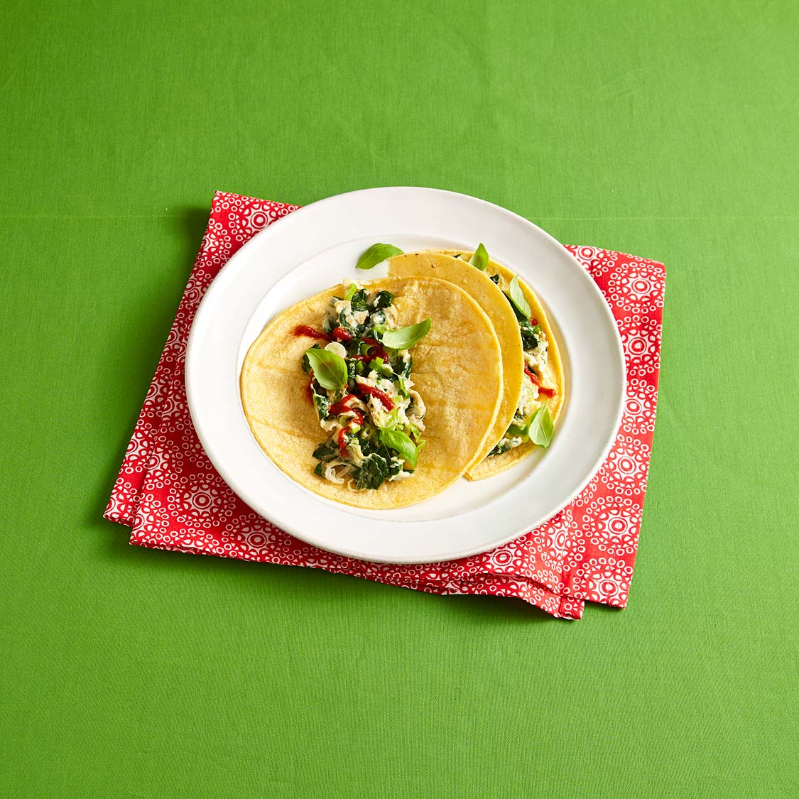 - Place warmed tortillas on a plate and divide egg and veggie mixture evenly between tortillas.