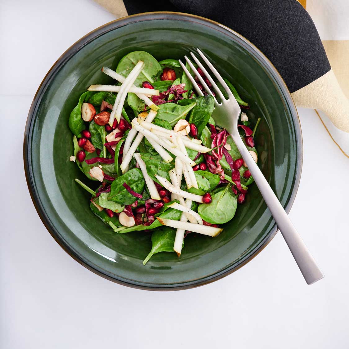 - In a large serving bowl, toss the radicchio, spinach, hazelnuts, and pomegranate seeds with the pomegranate vinaigrette. Divide evenly among 6 plates.