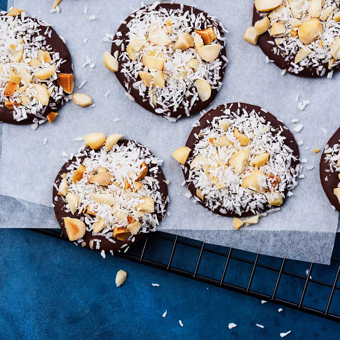 - Spoon 1 tbsp melted chocolate onto the baking sheet and spread into a 2 1/2-inch circle with the back of the spoon. Sprinkle with the macadamia/coconut mixture, then press lightly into chocolate. Repeat until you have all 12 bites completed. Work quickly so that the chocolate does not harden before you are done.