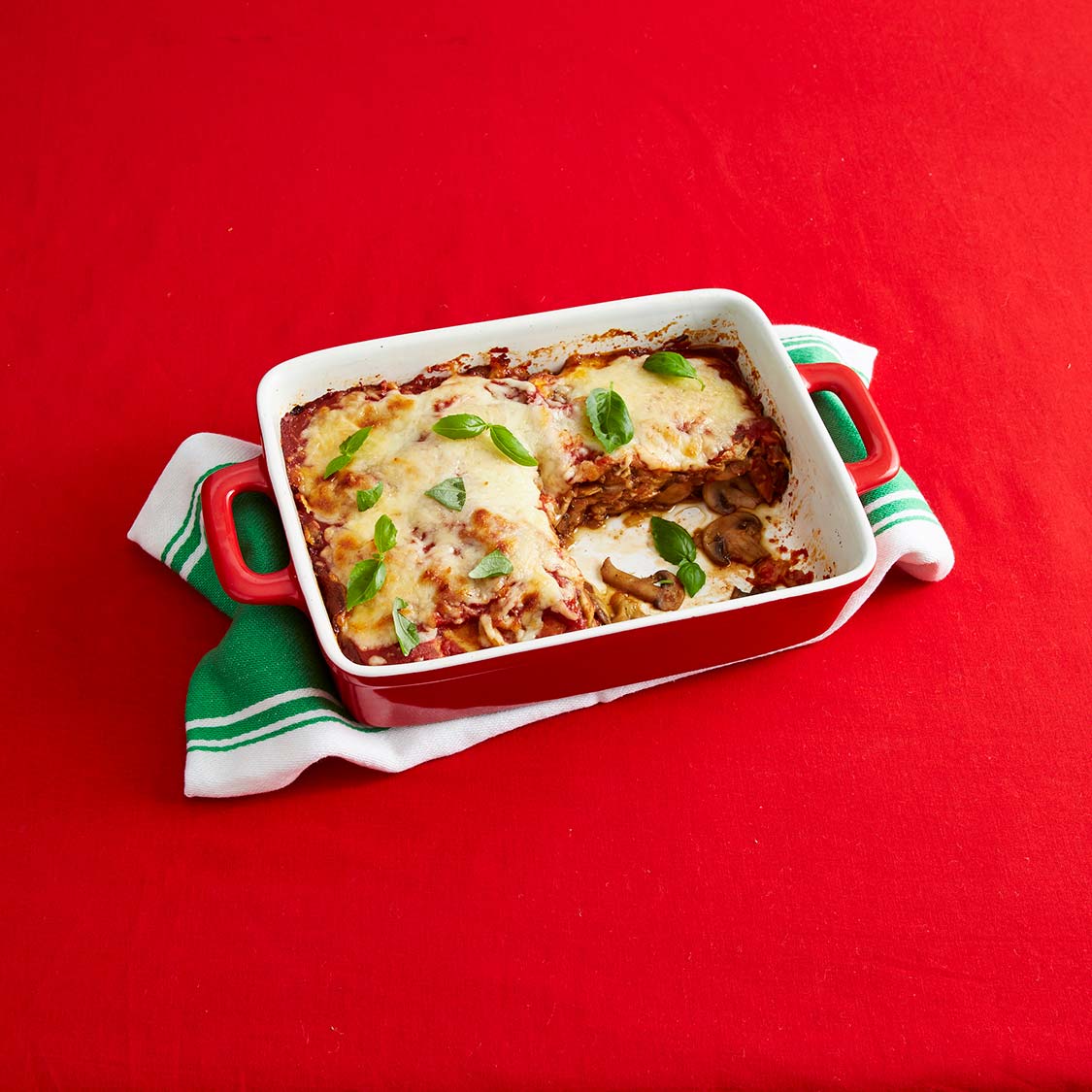Indulge in a lighter take on a classic Italian favorite featuring tender eggplant slices layered with mushrooms and mozzarella.