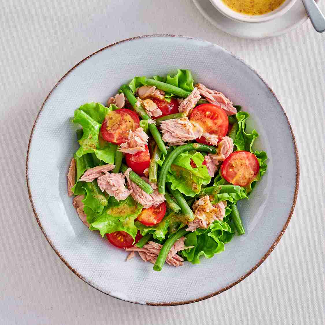 - Place lettuce, green beans, tuna and tomatoes in large bowl.