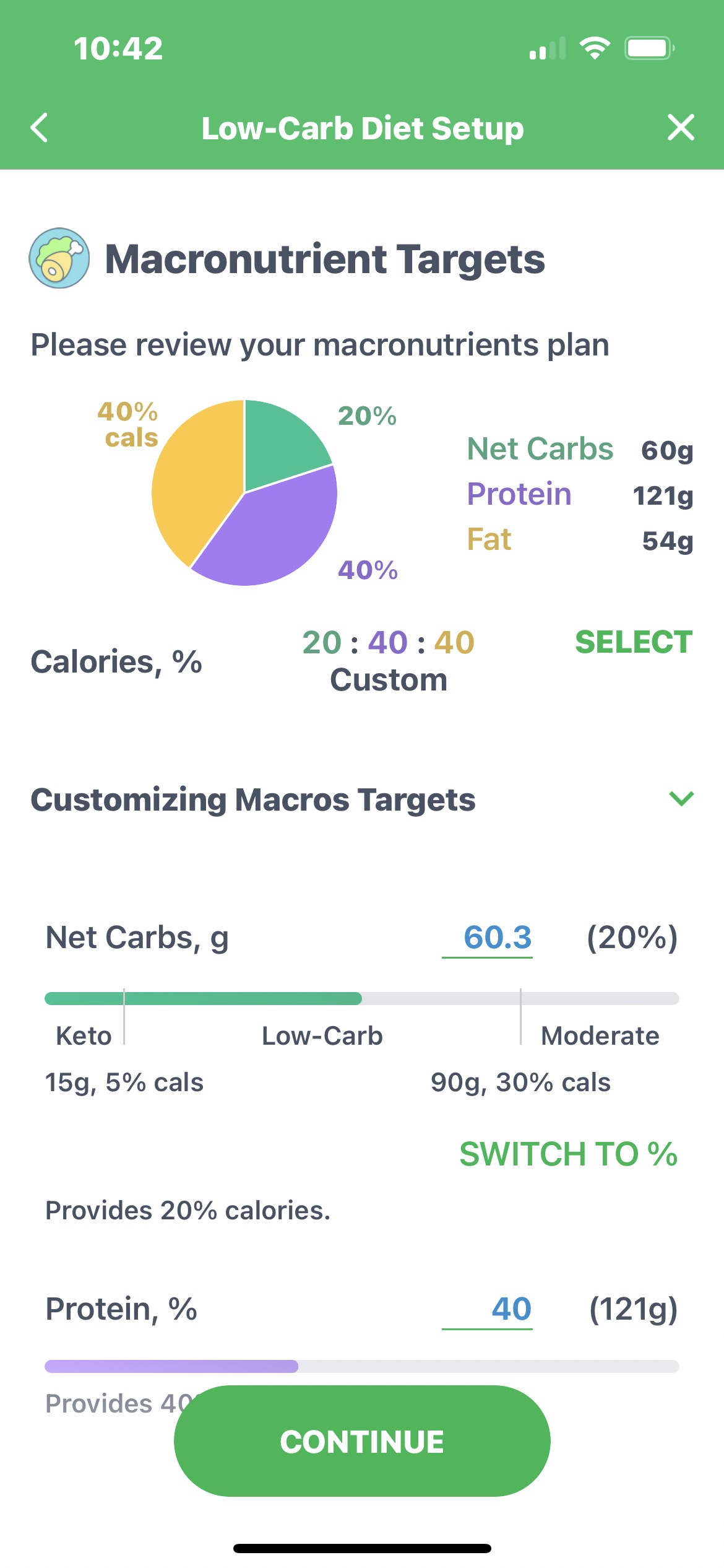 MyNetDiary Premium low-carb plan will help you set your individual protein goal. The default plan provides 40% of calories from protein. Getting enough protein helps minimize muscle loss and can help you feel fuller.